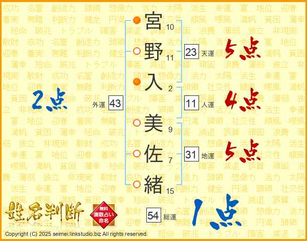 宮(10画)野(11画)入(2画) 美(9画)佐(7画)緒(15画)