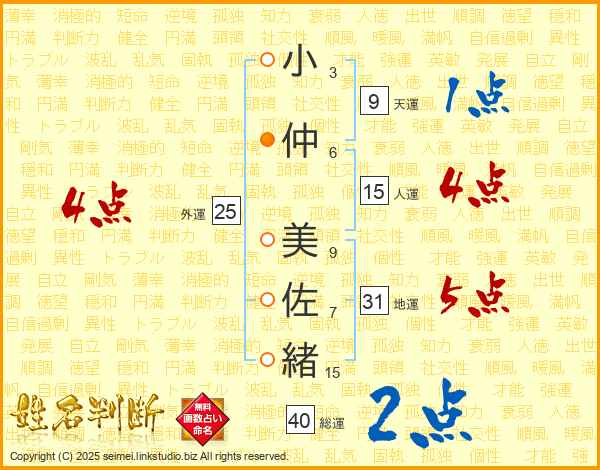 小(3画)仲(6画) 美(9画)佐(7画)緒(15画)
