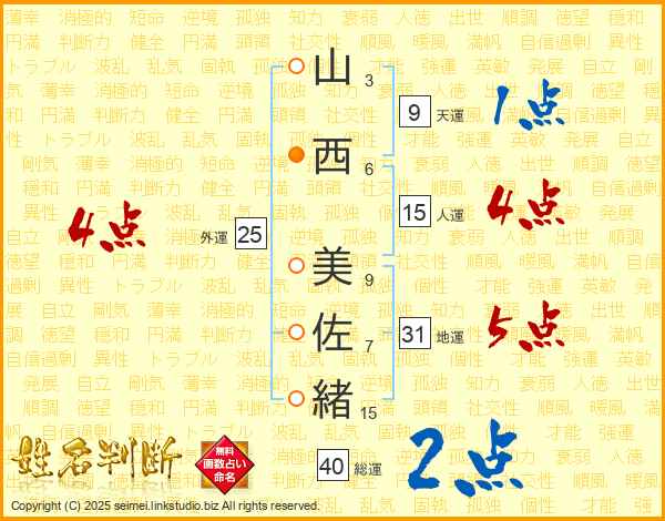 山(3画)西(6画) 美(9画)佐(7画)緒(15画)
