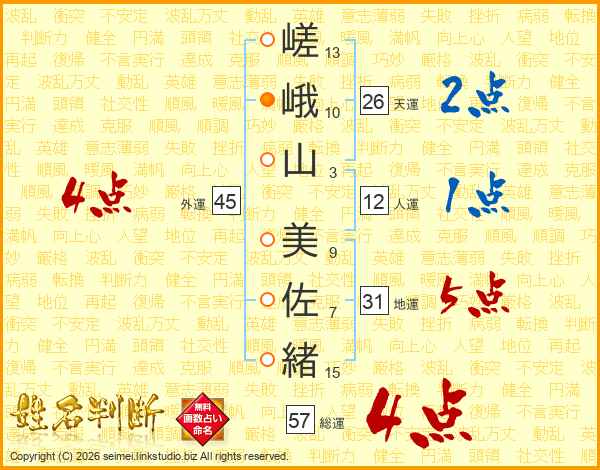 嵯(13画)峨(10画)山(3画) 美(9画)佐(7画)緒(15画)