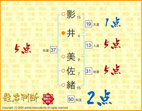 影(15画)井(4画) 美(9画)佐(7画)緒(15画)