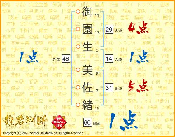 御(11画)園(13画)生(5画) 美(9画)佐(7画)緒(15画)