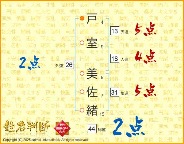 戸(4画)室(9画) 美(9画)佐(7画)緒(15画)