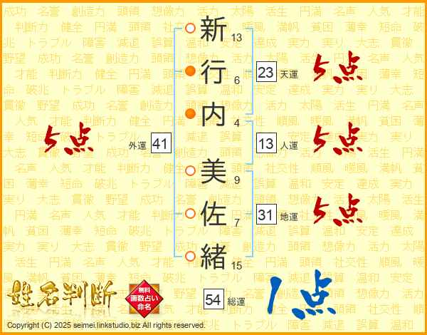 新(13画)行(6画)内(4画) 美(9画)佐(7画)緒(15画)