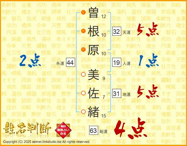 曽(12画)根(10画)原(10画) 美(9画)佐(7画)緒(15画)