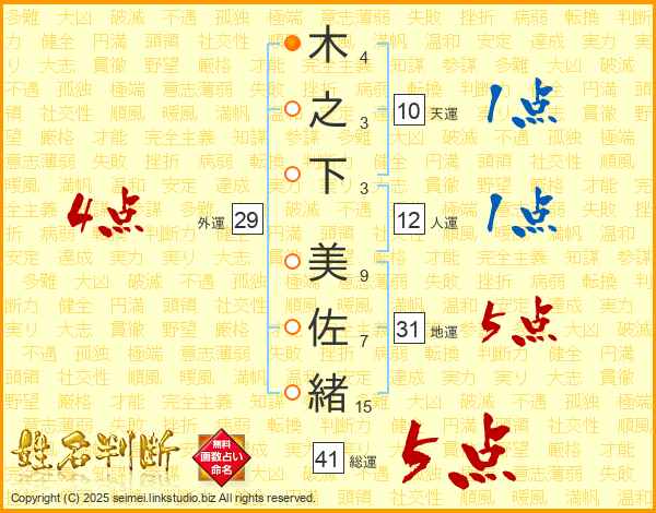 木(4画)之(3画)下(3画) 美(9画)佐(7画)緒(15画)