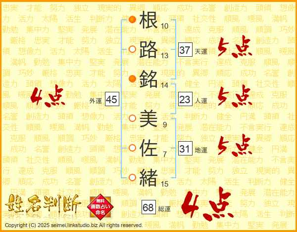 根(10画)路(13画)銘(14画) 美(9画)佐(7画)緒(15画)