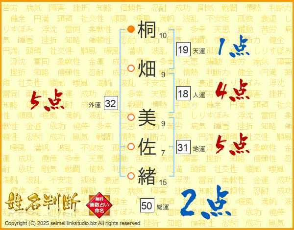 桐(10画)畑(9画) 美(9画)佐(7画)緒(15画)