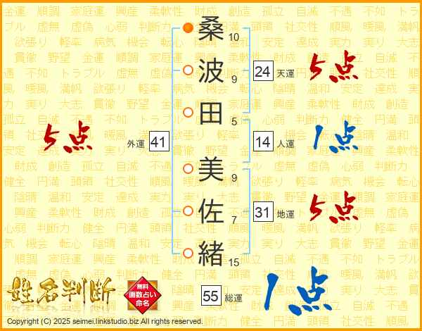 桑(10画)波(9画)田(5画) 美(9画)佐(7画)緒(15画)