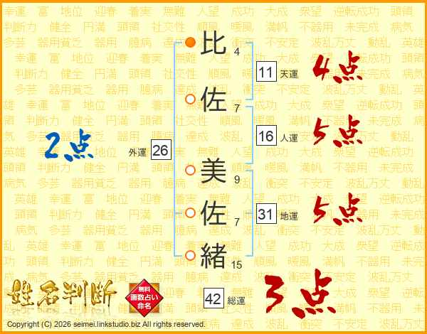 比(4画)佐(7画) 美(9画)佐(7画)緒(15画)