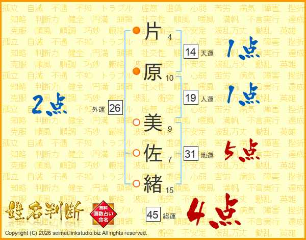 片(4画)原(10画) 美(9画)佐(7画)緒(15画)