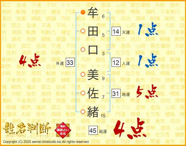牟(6画)田(5画)口(3画) 美(9画)佐(7画)緒(15画)