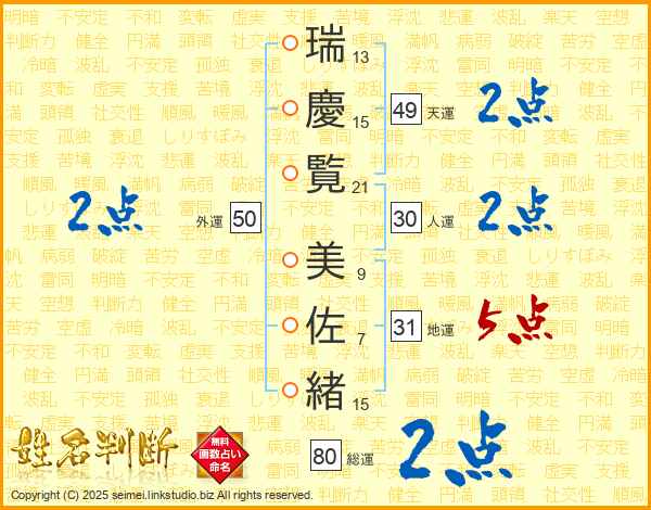 瑞(13画)慶(15画)覧(21画) 美(9画)佐(7画)緒(15画)