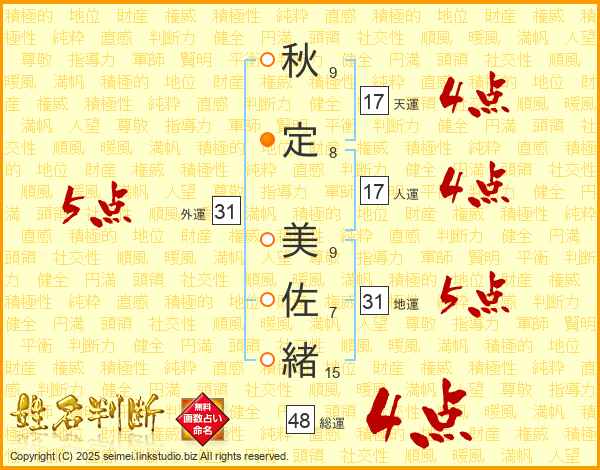 秋(9画)定(8画) 美(9画)佐(7画)緒(15画)