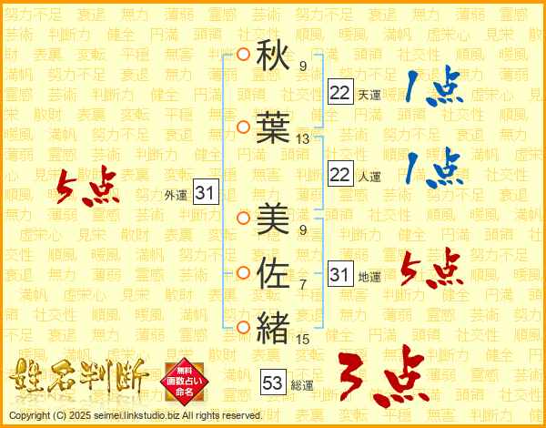 秋(9画)葉(13画) 美(9画)佐(7画)緒(15画)