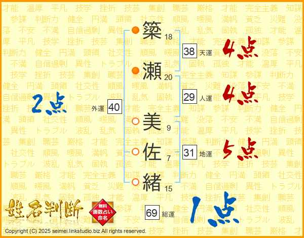 簗(18画)瀬(20画) 美(9画)佐(7画)緒(15画)