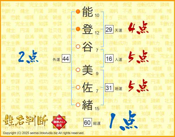 能(10画)登(12画)谷(7画) 美(9画)佐(7画)緒(15画)