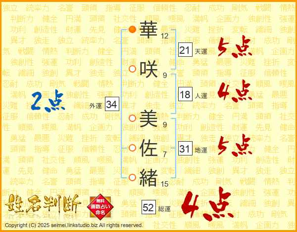 華(12画)咲(9画) 美(9画)佐(7画)緒(15画)