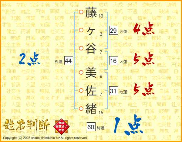 藤(19画)ヶ(3画)谷(7画) 美(9画)佐(7画)緒(15画)