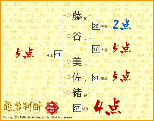 藤谷美佐緒さんの総運は57画の4点!