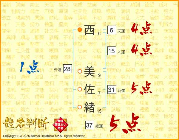 西(6画) 美(9画)佐(7画)緒(15画)