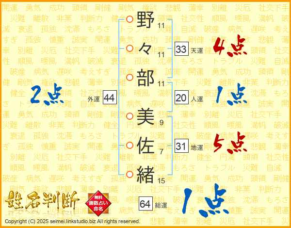 野(11画)々(11画)部(11画) 美(9画)佐(7画)緒(15画)