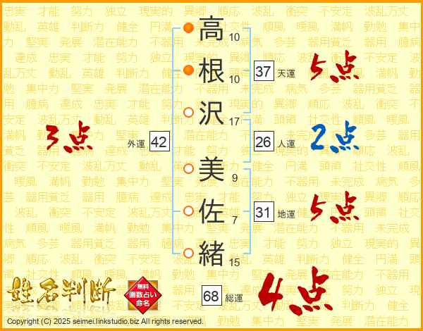 高(10画)根(10画)沢(17画) 美(9画)佐(7画)緒(15画)