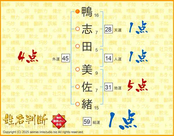 鴨(16画)志(7画)田(5画) 美(9画)佐(7画)緒(15画)