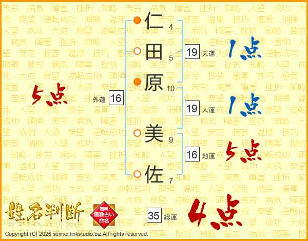 仁(4画)田(5画)原(10画) 美(9画)佐(7画)