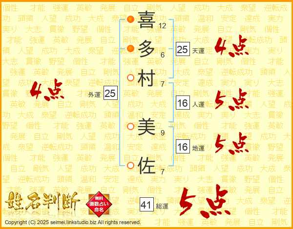 喜(12画)多(6画)村(7画) 美(9画)佐(7画)