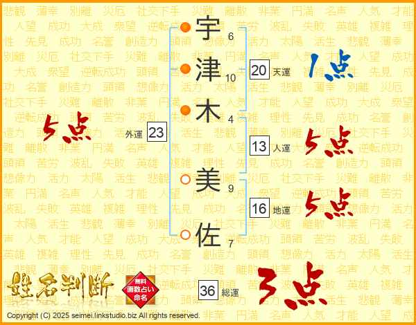 宇(6画)津(10画)木(4画) 美(9画)佐(7画)