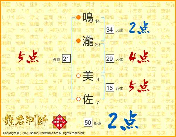 鳴(14画)瀧(20画) 美(9画)佐(7画)