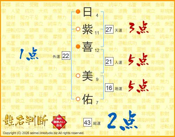 日(4画)紫(11画)喜(12画) 美(9画)佑(7画)