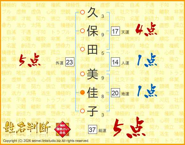 久(3画)保(9画)田(5画) 美(9画)佳(8画)子(3画)