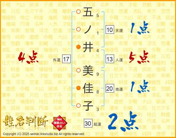 生活面を象徴する運勢です。外部から受ける影響力を表し、結婚運、家庭運や職場、環境への順応性を表します。総運から人運を引いた画数。姓や名が1文字の場合を除く。