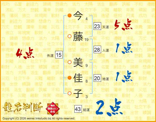 今(4画)藤(19画) 美(9画)佳(8画)子(3画)