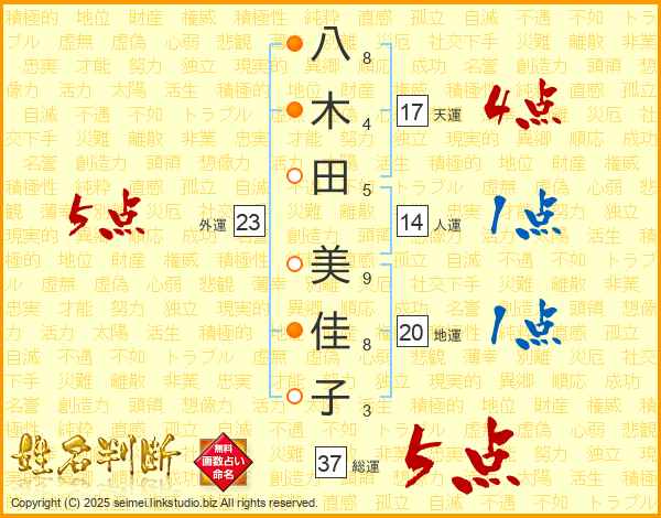 八(8画)木(4画)田(5画) 美(9画)佳(8画)子(3画)