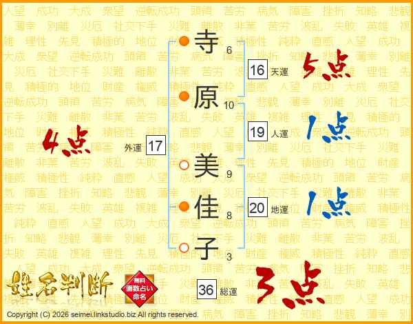 寺(6画)原(10画) 美(9画)佳(8画)子(3画)