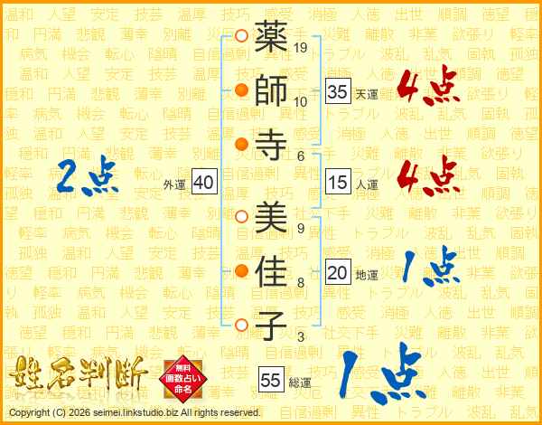 薬(19画)師(10画)寺(6画) 美(9画)佳(8画)子(3画)