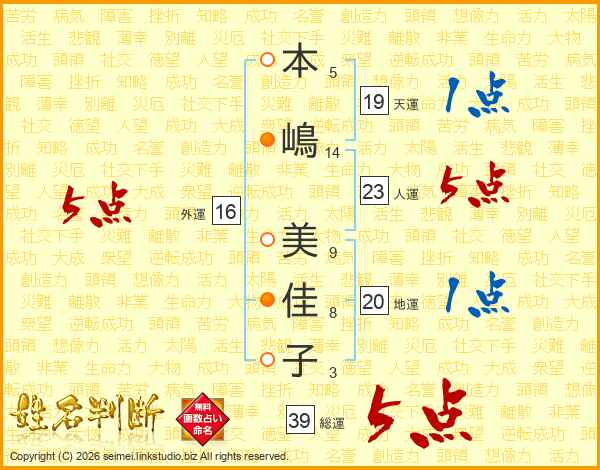 本(5画)嶋(14画) 美(9画)佳(8画)子(3画)