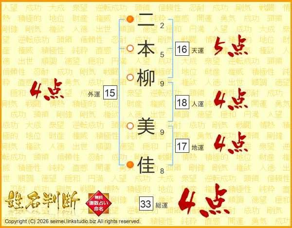 二本柳美佳さんの総運は33画の4点!