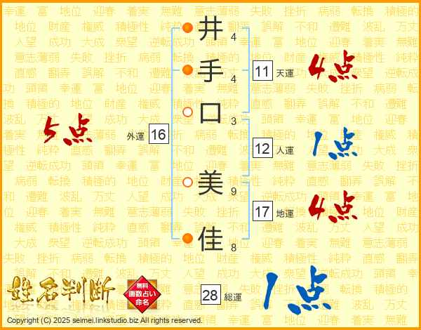 井(4画)手(4画)口(3画) 美(9画)佳(8画)