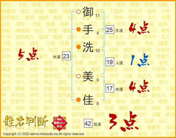 御(11画)手(4画)洗(10画) 美(9画)佳(8画)