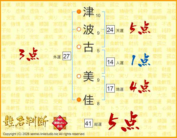 津(10画)波(9画)古(5画) 美(9画)佳(8画)