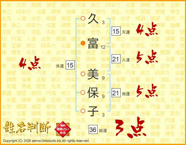 久(3画)富(12画) 美(9画)保(9画)子(3画)