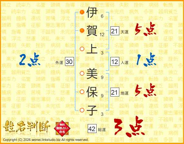 伊(6画)賀(12画)上(3画) 美(9画)保(9画)子(3画)