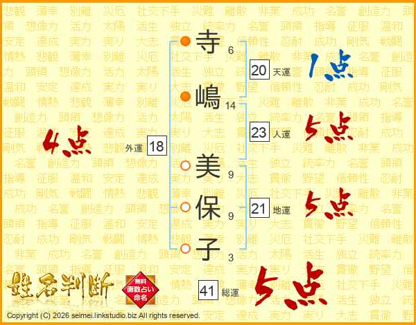 寺(6画)嶋(14画) 美(9画)保(9画)子(3画)