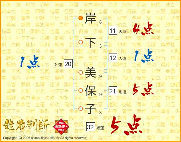 岸下美保子さんの総運は32画の5点!