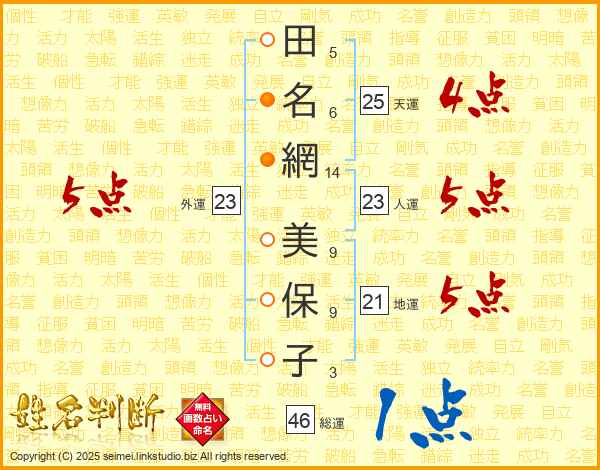 田(5画)名(6画)網(14画) 美(9画)保(9画)子(3画)