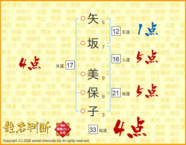 矢坂美保子さんの総運は33画の4点!